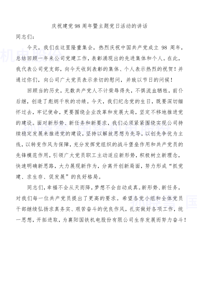 今年是建黨98周年?!捌咭弧鼻昂螅尻枃F機(jī)電股份有限公司開展了豐富多彩的紀(jì)念活動,以傳承紅色基因、弘揚(yáng)革命精神,不忘初心、牢記使命,矢志為中華民族偉大復(fù)興中國夢努力奮斗。